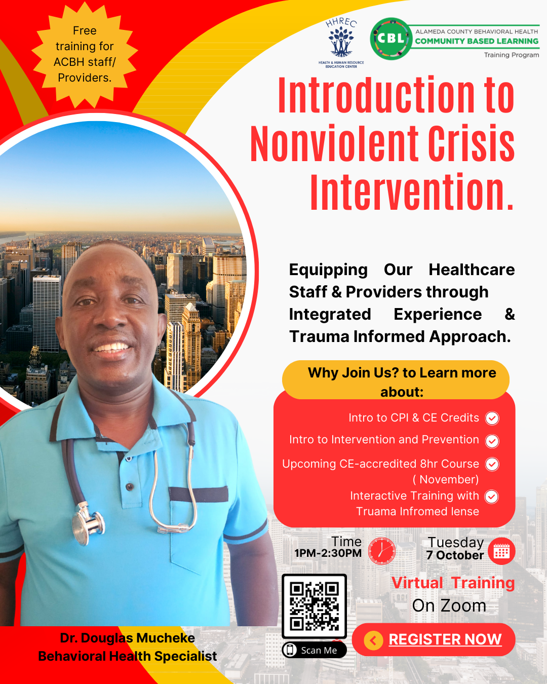 AUDIENCE: Alameda County Behavioral Health staff, and it’s contracted community-based organization (CBO) providers; Therapists, Psychologists, Social Workers, Psychiatrists, mental health Interns, Post Doc Residents, Physicians, Nurses, Dietitians, Mental Health Rehabilitation Specialists, Peer Support Specialists, and Substance Use Disorder Specialists.