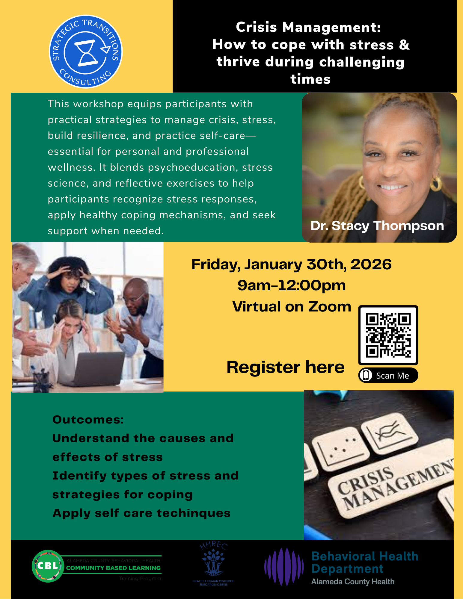 DESCRIPTION: This workshop equips participants practical strategies to manage crisis, stress, build resilience, and practice self-care essential for personal and professional wellness. It blends psychoeducation, stress science, and reflective exercises to help participants recognize stress responses, apply healthy coping mechanisms, and seek support when needed.